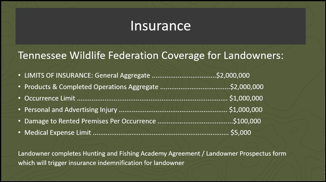 No, Tennessee Wildlife Federation has an insurance policy that covers landowners. The specifics of this coverage are included in the image below.